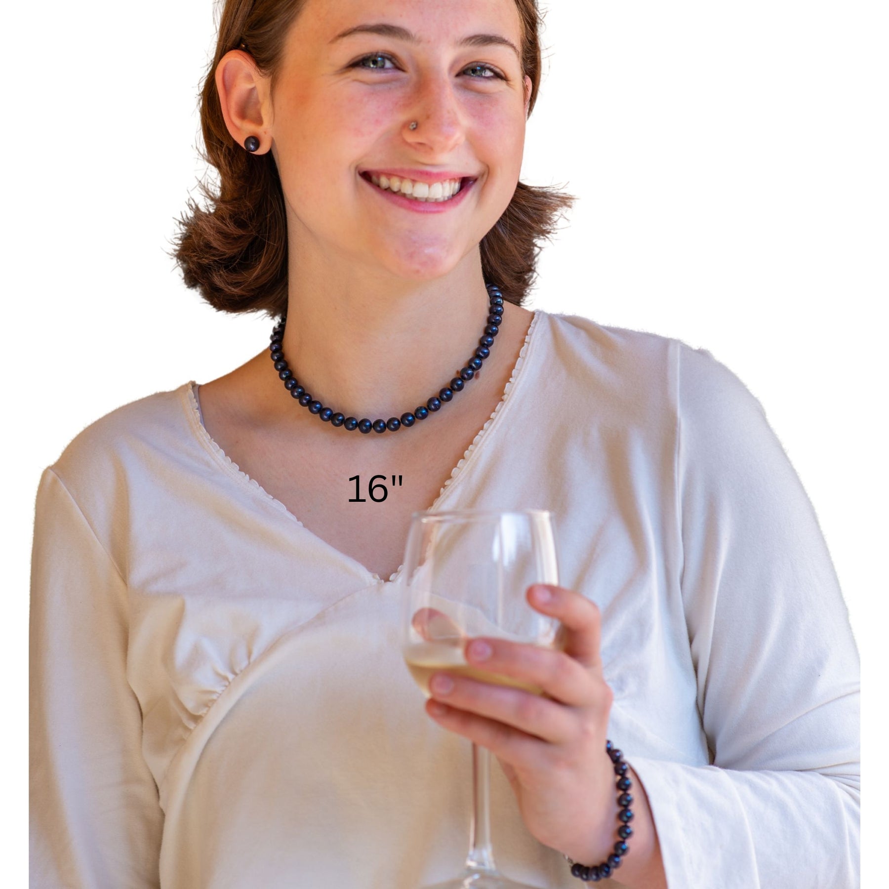 Premium grade 16 Inch Choker Pearl Set with black pearl necklace bracelet & earrings featuring the most desired round shaped cultured freshwater pearls. The pearls are round to the eye. Pearl surface is lightly blemished. Necklace Length: 16 inch; Bracelet Length: 7 inch.