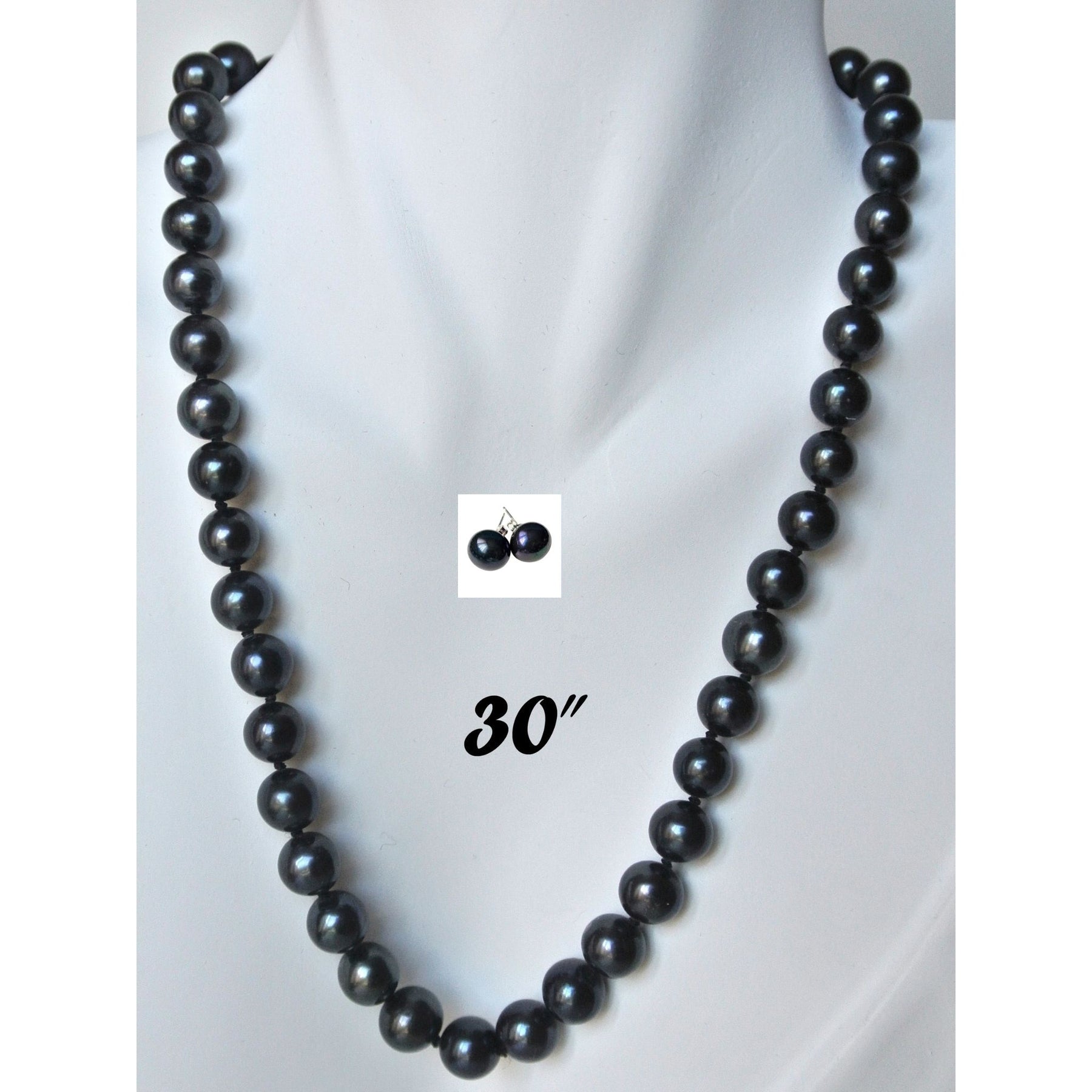 Long 30 Inch ROUND Black Pearl Set Necklace Earrings