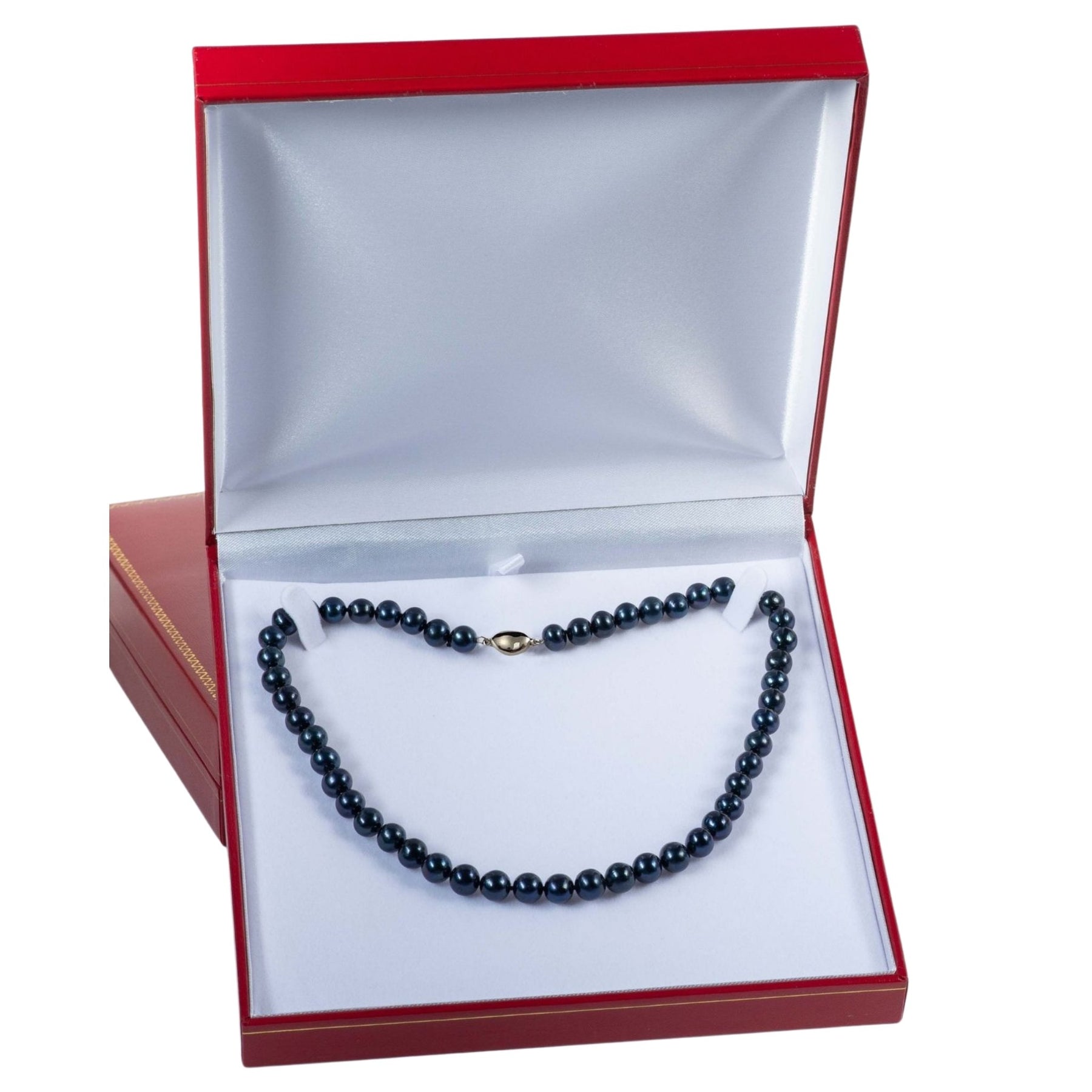 This gorgeous 20 inch black pearl necklace features the most desired round shaped cultured pearls. The pearls are round to the eye. Pearl surface is lightly blemished. Necklace clasp: sturdy and stylish pea clasp, 925 Sterling Silver 18k white gold-plated. Comes in a luxury jewelry presentation box. Buy this gorgeous pearl necklace today!