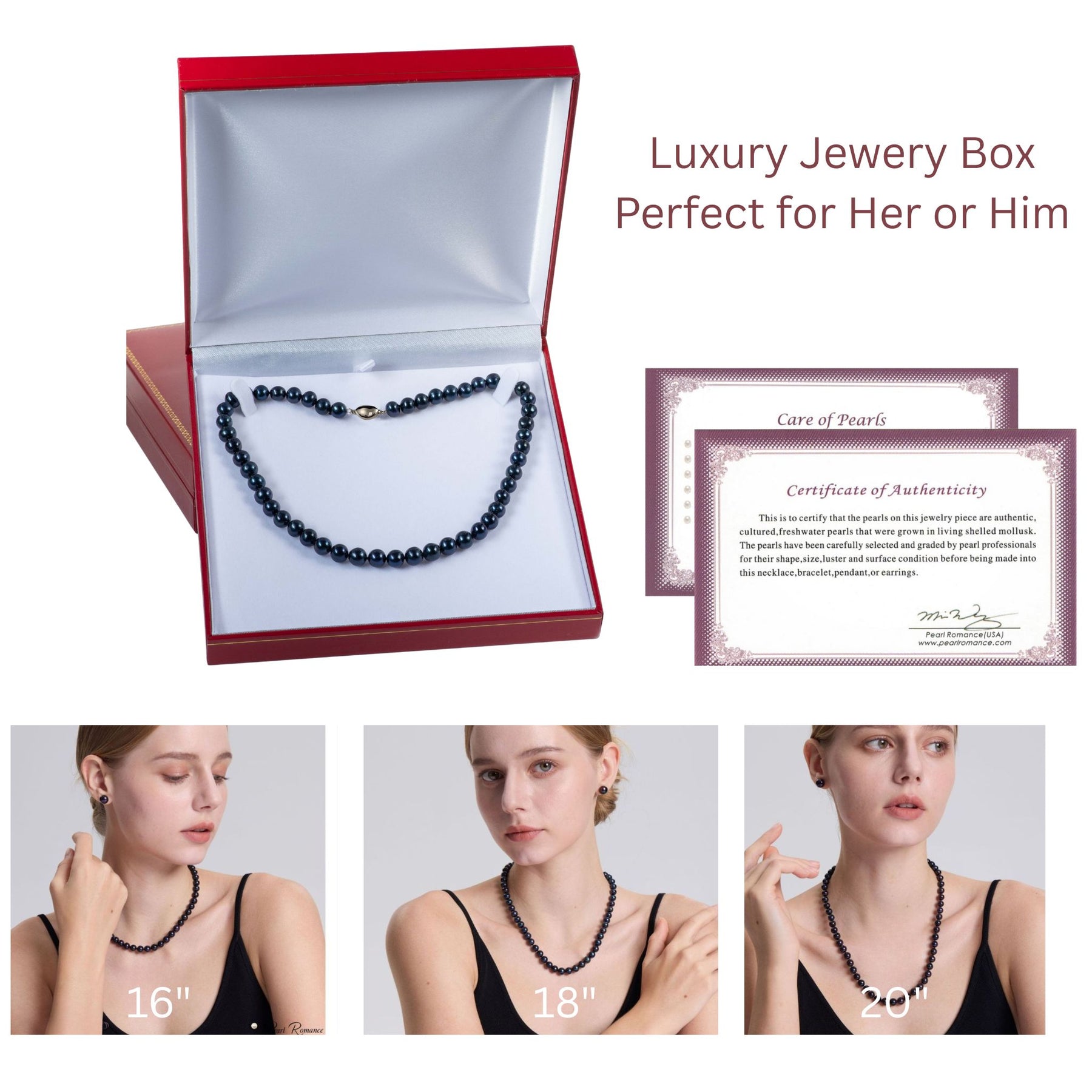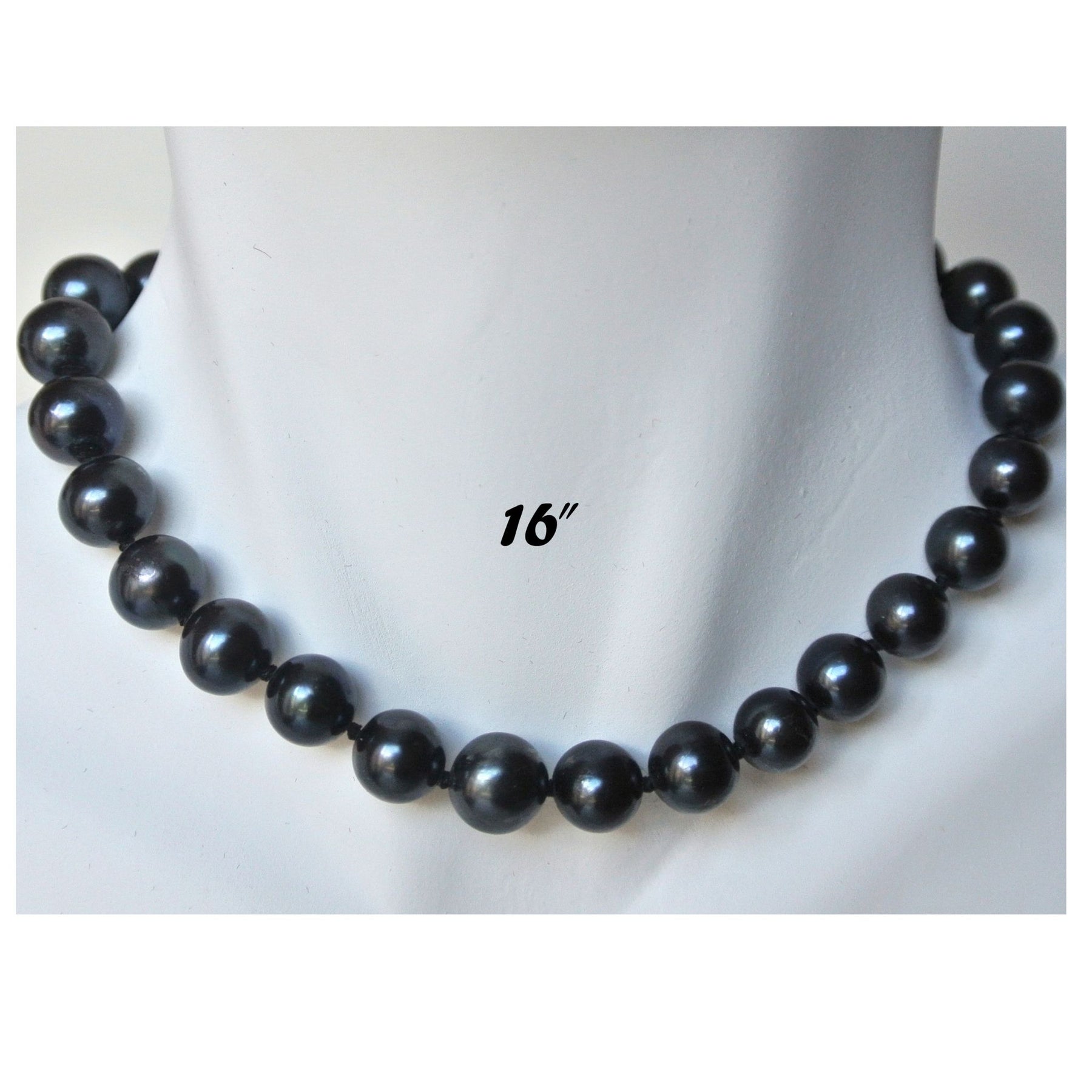 This gorgeous 16 inch black choker pearl necklace features the most desired round shaped cultured pearls. The pearls are round to the eye. Pearl surface is lightly blemished. Necklace clasp: sturdy and stylish pea clasp, 925 Sterling Silver 18k white gold-plated. Comes in a luxury jewelry presentation box. Buy this gorgeous pearl necklace today!